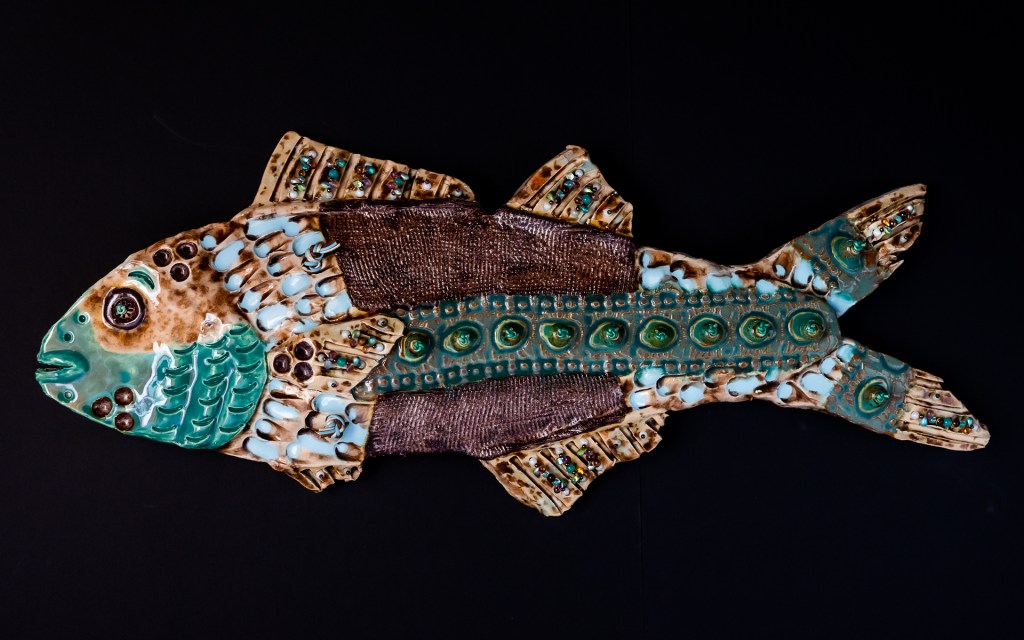 Ceramic wall pieces “embellished with a rich mixture of semi-precious stones, beads, metallic adornments and/or leather, (hand-sewn into the work itself.) The work has textile-like qualities.”